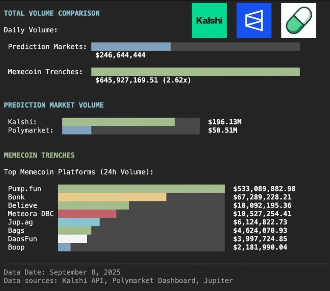 上個月剛入職 Kalshi 擔任加密貨幣主管的 John Wang 在近日公布了一組數據,數據表明現在的預測市場已經達到了 Solana Memecoins 整體市場總交易量的 38%。